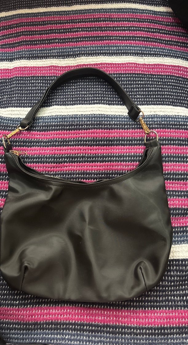 Siyah sentetik kumaştan fermuarlı kadın omuz çantası, sokak tarzı ve günlük kullanım için uygun. Bohem ve retro stillerle uyumlu.