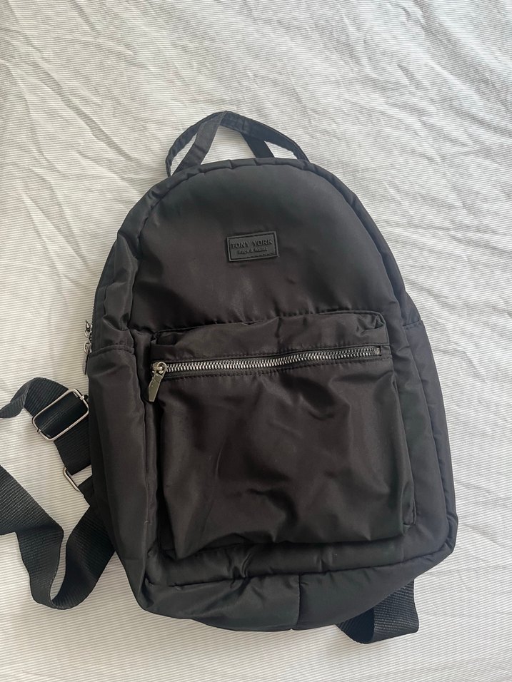 Siyah renkli, fermuarlı ön cepli, sentetik kumaştan kadın sırt çantası. Minimalist tasarımı günlük sokak stiline uygundur.