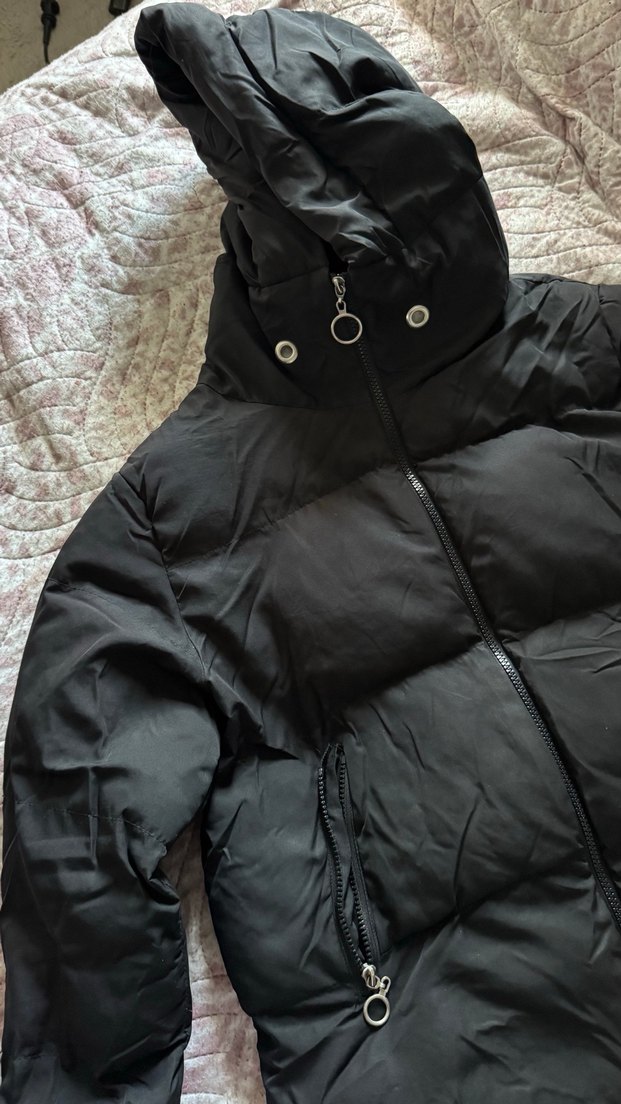 Siyah, fermuarlı kapüşonlu şişme mont. Bol geldiği için satıyorum. Hiçbir deformesi yok. Sapasağlam paketledim kaldırdım.