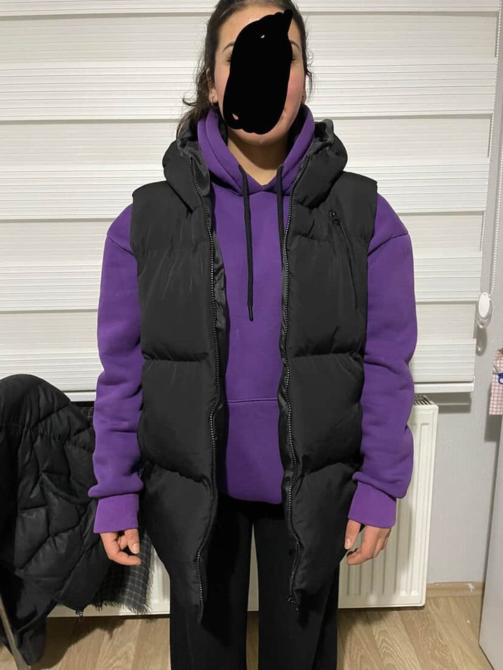 Siyah renkte, fermuarlı ve yüksek yakalı, sentetik kumaştan yapılmış, fitted kesim şişme kadın yelek. Günlük kullanım için uygun, rahat ve şık.buradaki boy 155 kilo 52 ürün yeni tertemiz