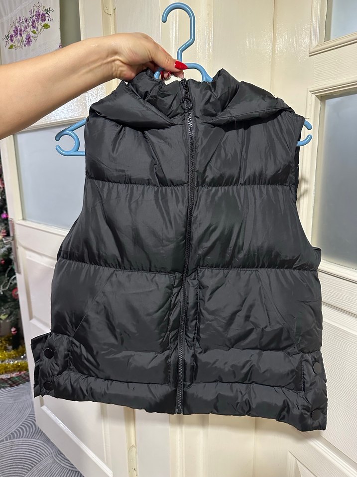 Siyah, fermuarlı, yüksek yakalı, kolsuz, sentetik kumaştan şişme kadın yelek. Sokak stiline uygun, dış mekan kullanımı için ideal. Marka temsili.