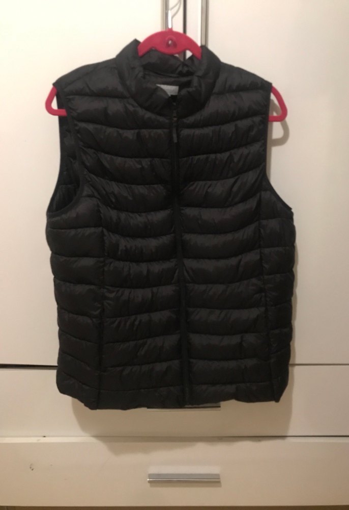 Fermuarlı, yüksek yakalı, siyah kolsuz şişme yelek. Sentetik kumaştan, midi boy ve dar kesim, günlük sokak stiline uygun. Almanya’dan almıştık 2-3 kez giyildi