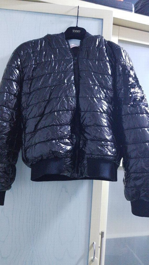 Siyah, fermuarlı, dar kesim kadın mont. Sentetik kumaştan, crew yakalı, parlak ve deseniz. Günlük sokak stili için uygun.