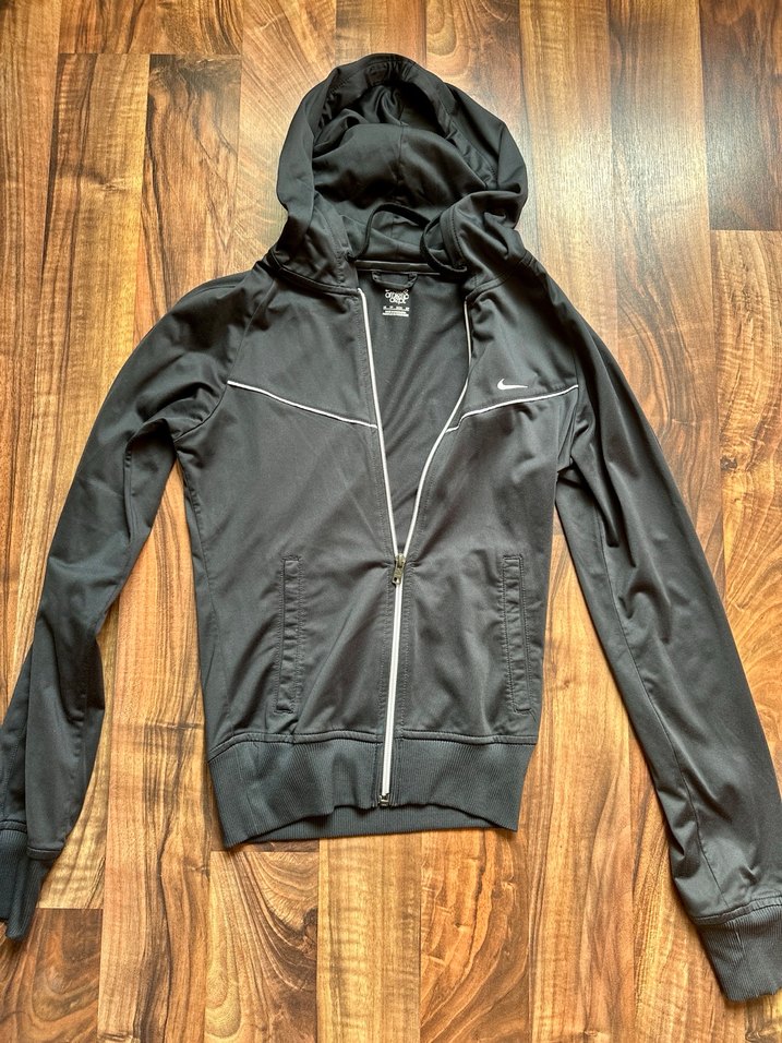 Orjinal Nike Siyah, fermuarlı, yüksek yakalı ve uzun kollu kadın spor ceketi. Sentetik kumaştan, midi uzunlukta, şık ve rahat bir görünüme sahiptir.