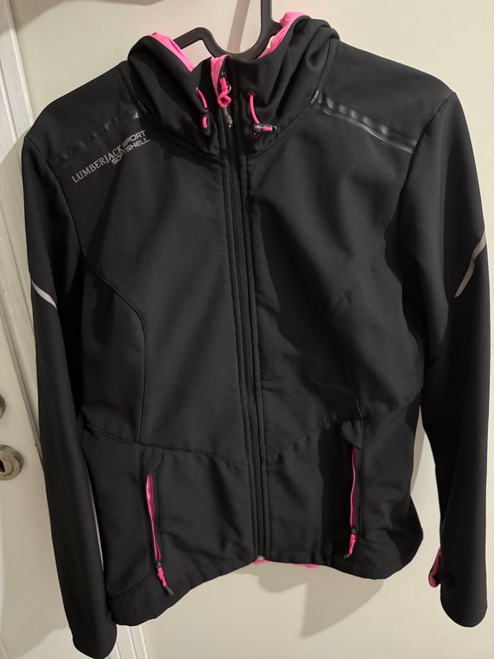 Fermuarlı cepleri, yüksek yakası ve uzun kolları olan siyah, yumuşak ve sıcak kumaştan kadın ceketi. 48*64 ölçüleri. Su ve rüzgar geçirmez.