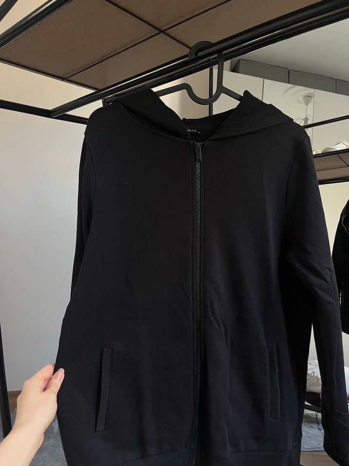 Siyah, fermuarlı, uzun kollu ve bisiklet yaka kadın spor ceketi. Yumuşak ve sıcak kumaştan, rahat ve şık bir görünüm sunar.
