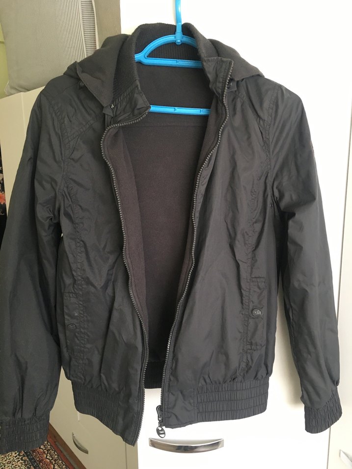 Siyah, yüksek yakalı, fermuarlı ve uzun kollu kadın spor ceket. Yumuşak ve sıcak bir kumaştan yapılmış, dış mekan kullanımı için uygundur.