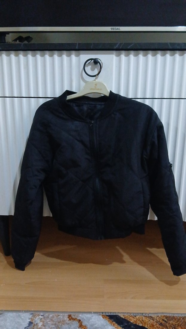 Fermuarlı, uzun kollu ve bisiklet yaka olan bu siyah kadın ceket, sentetik kumaştan üretilmiş ve günlük kullanıma uygun minimalist bir tarza sahiptir.