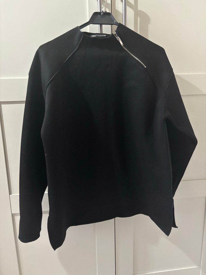 Siyah renkli, yuvarlak yakalı, uzun kollu ve bol kesim kadın sweatshirt. Yaka kısmında fermuar detayı bulunur, yumuşak ve sıcak kumaştan üretilmiştir.