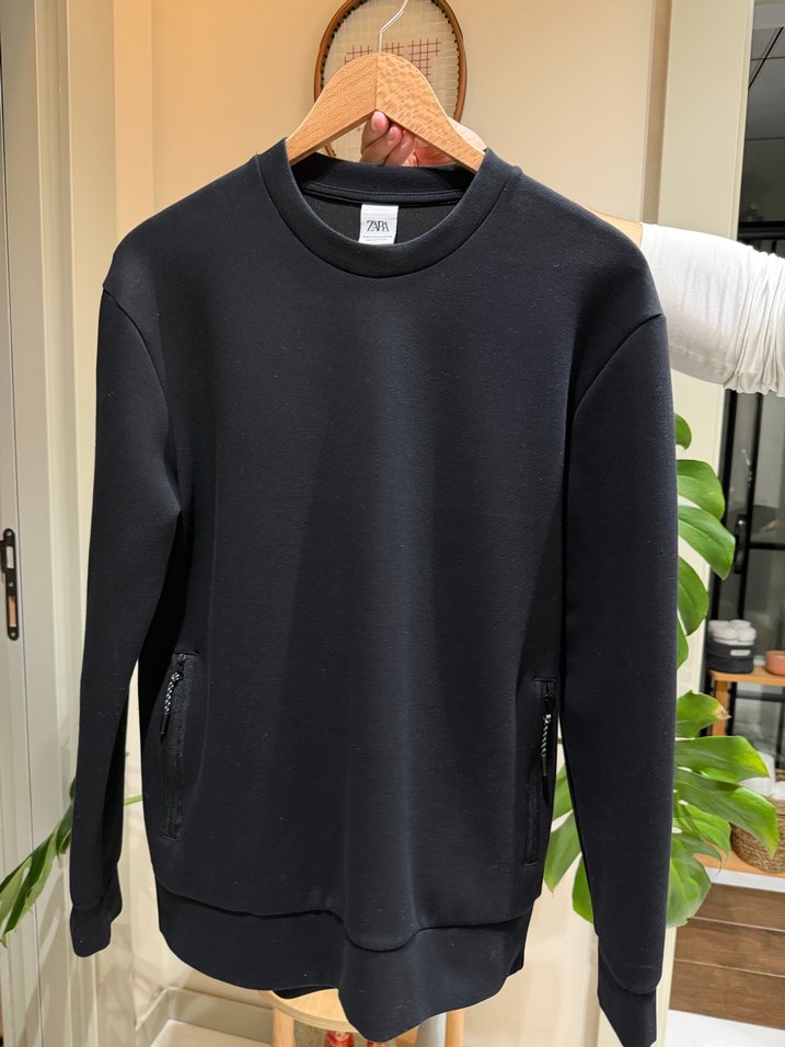 Siyah renkli, yuvarlak yakalı ve uzun kollu kadın sweatshirtü, bol kesim ve fermuarlı cepler içerir. Orta uzunlukta ve yumuşak, sıcak kumaştan üretilmiştir.