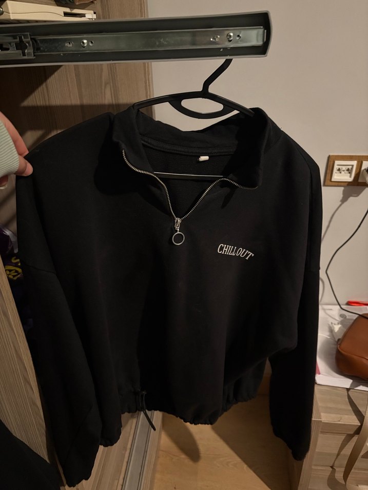 Küçük bir lekesi var. Siyah pamuklu kumaştan, bol kesim, uzun kollu ve yuvarlak yakalı fermuarlı sweatshirt. "CHILLOUT" baskılı, günlük rahat stil için uygun.