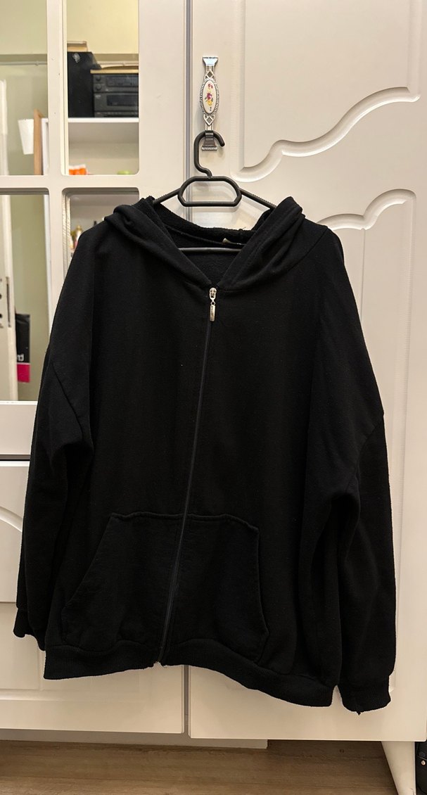 Siyah renkli, fermuarlı, uzun kollu ve bol kesim kadın sweatshirtü. Yuvarlak yaka ve yumuşak iç yüzeyiyle rahat kullanım sağlar.