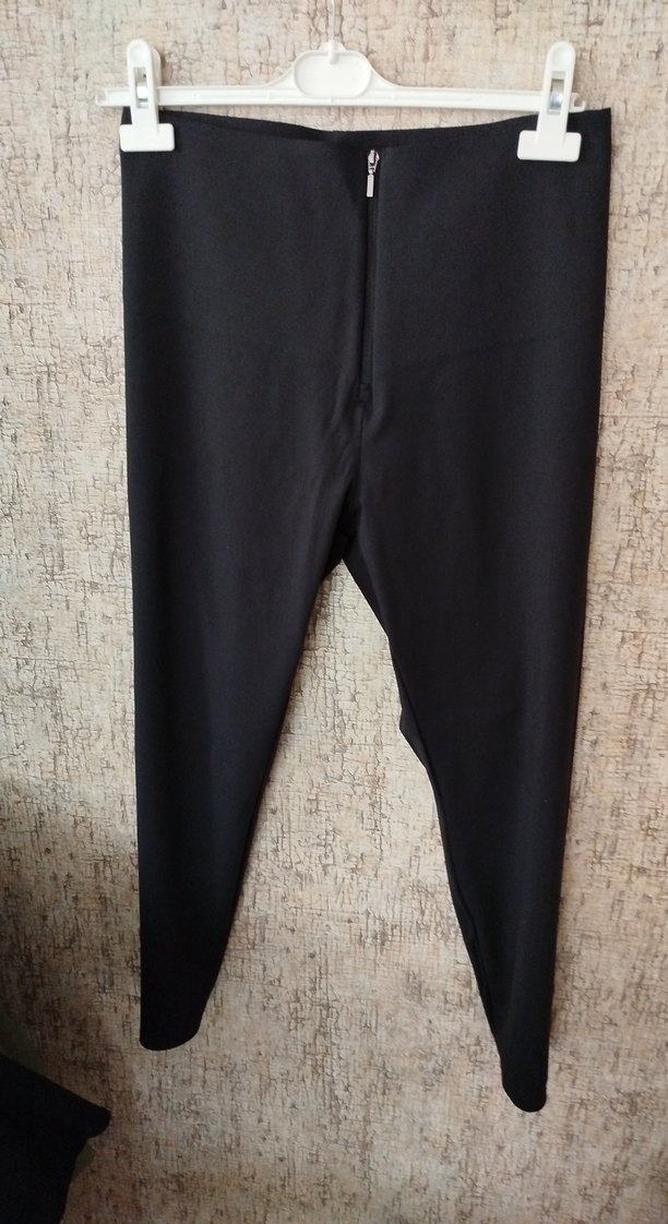 Sentetik kumaştan, ön fermuarlı, siyah ve dar kesim kadın tayt. Ofis ve sokak stili için uygundur.