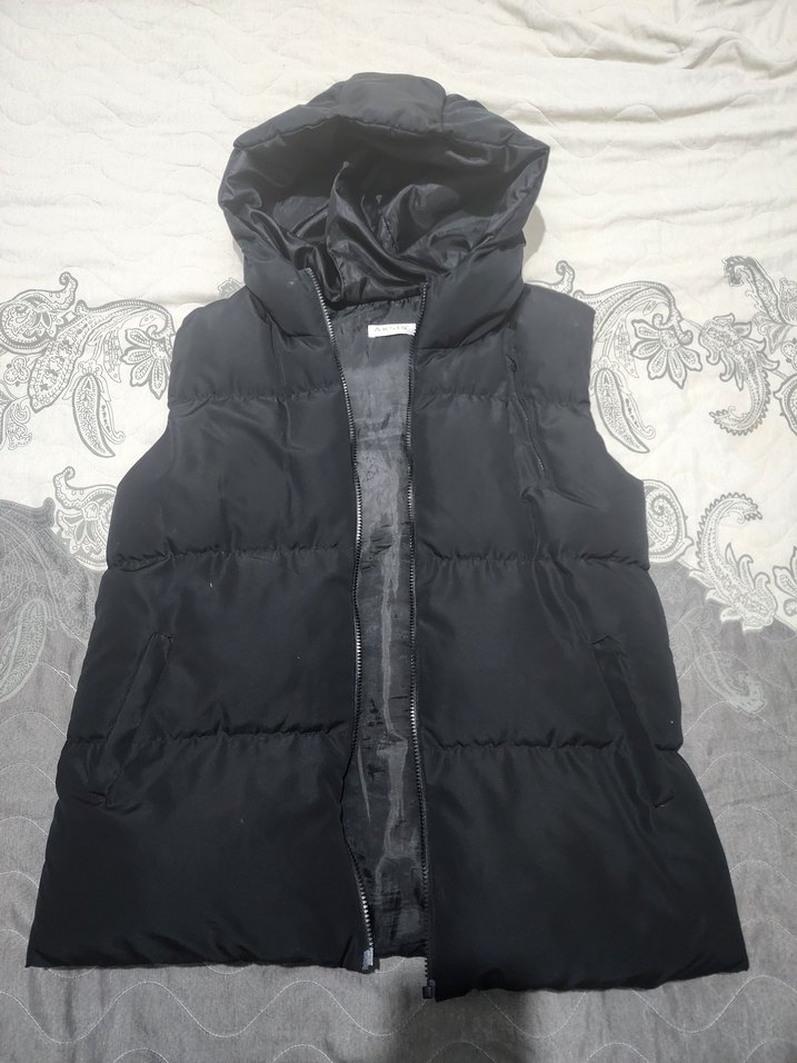 Yüksek yakalı, fermuarlı, siyah kolsuz yelek. Yumuşak ve sıcak kumaştan, dar kesim ve midi boyda, günlük kullanıma uygun.