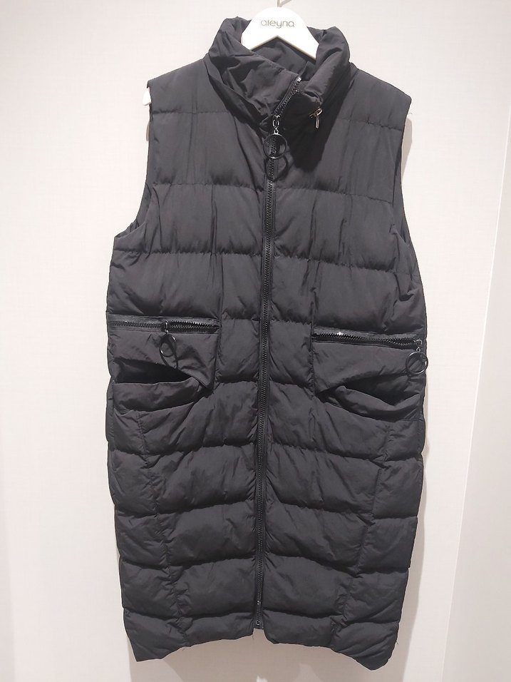 Siyah, fermuarlı, kolsuz yelek. Yüksek yakalı, midi boy ve vücuda oturan kesime sahip. Fermuarlı cepleriyle rahat ve şık bir sokak stili ürünü. Kapşonu mevcut. defosu yok. 36 beden.