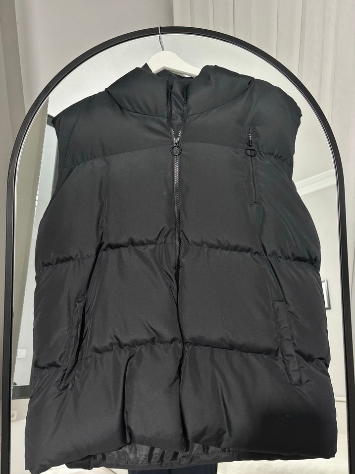 Siyah, fermuarlı ve yüksek yakalı kolsuz yelek. Yumuşak ve sıcak kumaştan, rahat ve şık bir görünüm için normal boyda, geniş kesim.