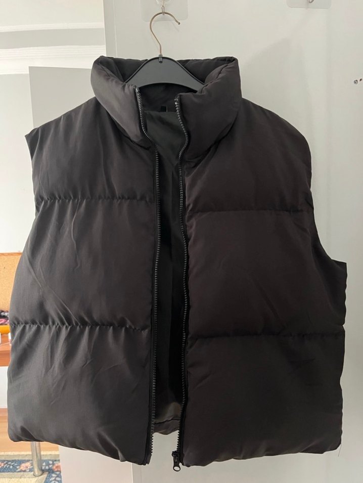 Siyah, fermuarlı, yüksek yakalı ve kolsuz bu yelek, yumuşak ve sıcak dokusuyla günlük sokak stili için uygundur. Temiz sorunsuz sıfır gibi