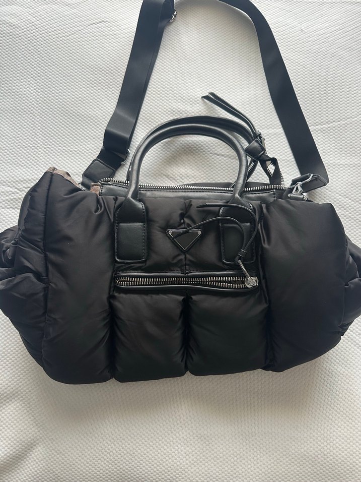 Siyah renkte, fermuarlı, sentetik kumaştan yapılmış kadın omuz çantasıdır. Sokak modası ve athleisure tarzını günlük kullanım için birleştirir. Kapitone çok temiz çantadır.