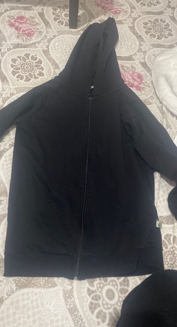 Siyah renkte, fermuarlı ve kapüşonlu uzun kollu kadın ceket. Rahat kesim ve yuvarlak yakaya sahip, günlük kullanıma uygun sıcak dokulu kumaş.