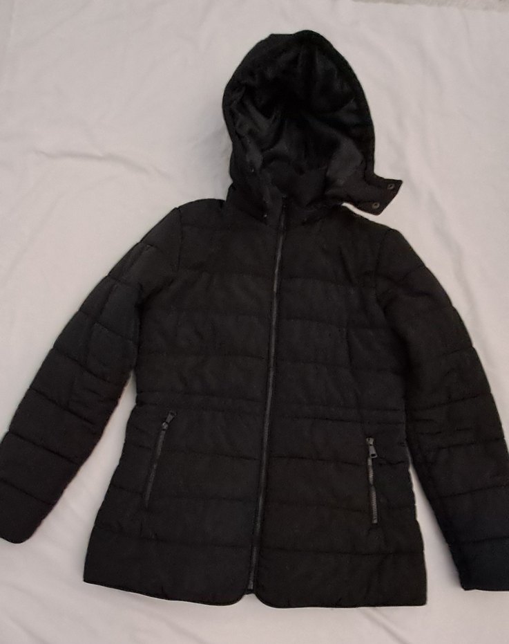 Siyah renkte, fermuarlı cepleri ve kesimli yakası olan, kapüşonlu normal midi uzunlukta, sıcak tutan kumaştan kadın kışlık mont. Boy 70 cm.koltuk altindan en 49 cm.alt kısımdan eni 53 cm.