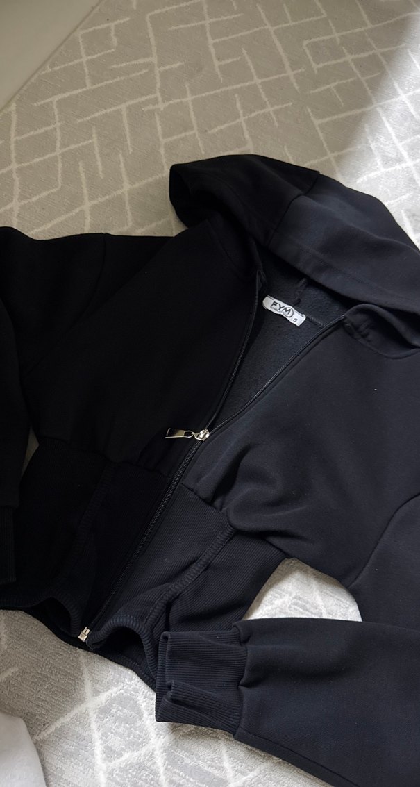 Fermuarlı ve kapüşonlu, siyah renkte, yumuşak ve sıcak kumaştan yapılmış, günlük sokak stiline uygun dar kesim kadın sweatshirtü.