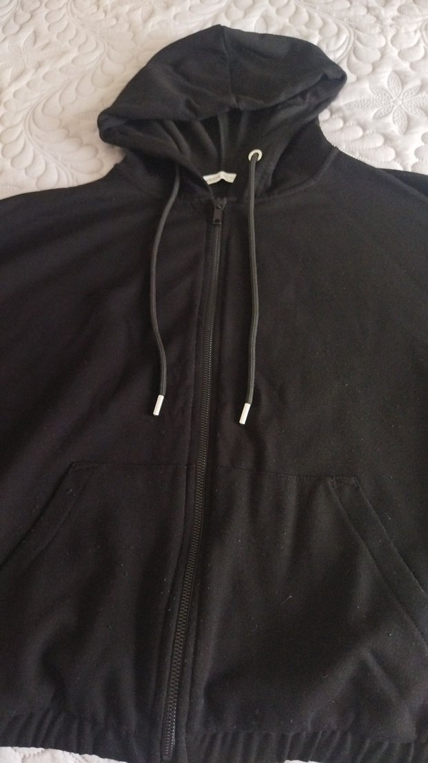 Siyah fermuarlı kapüşonlu, uzun kollu ve bol kesim kadın sweatshirt. Yumuşak ve sıcak kumaştan, normal midi boyda, ön cepli, günlük sokak stiline uygun. Ön yüzünde hafif tüylenmeler vardır