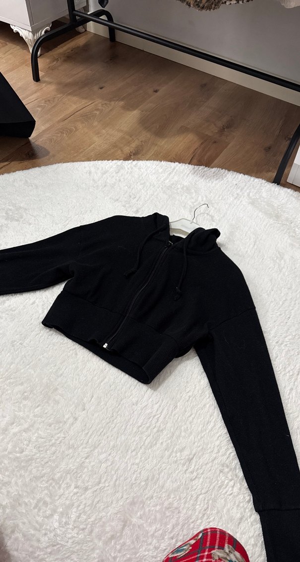 Fermuarlı önü, uzun kolları ve kapüşonu olan siyah, vücuda oturan sweatshirt. Yumuşak ve sıcak kumaştan, normal midi boyda günlük kullanım için uygundur.