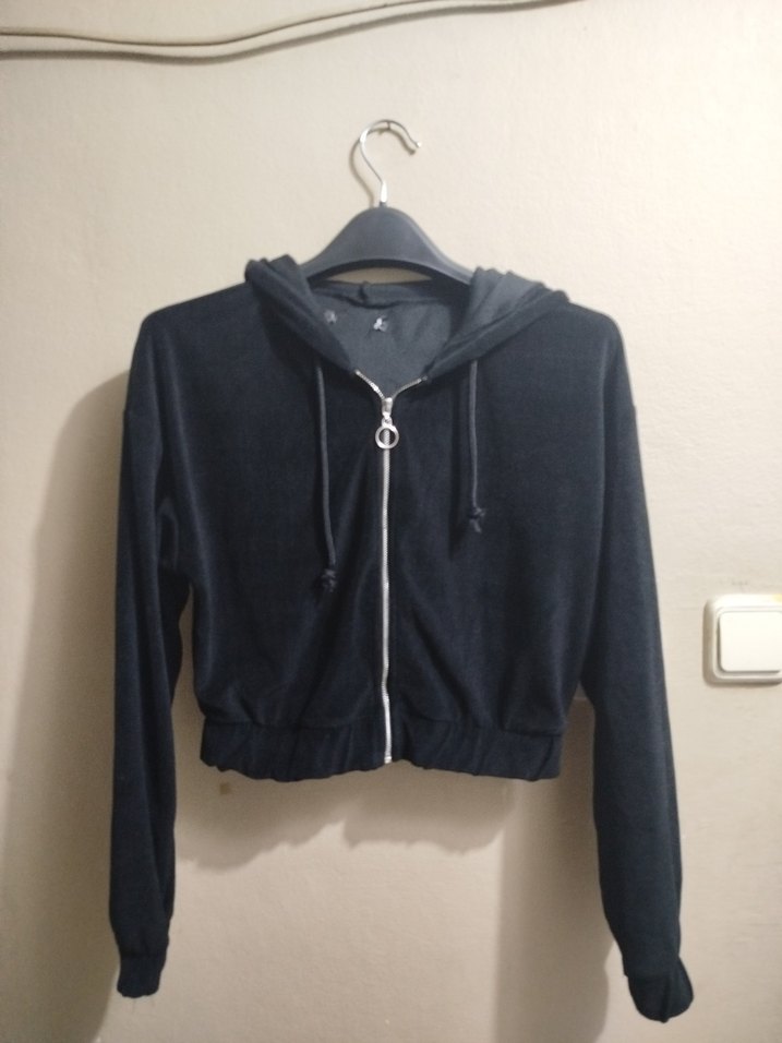 Siyah renkli, fermuarlı ve kapüşonlu, uzun kollu, vücuda oturan kadın hırka , yumuşak ve sıcak kumaştan üretilmiştir .