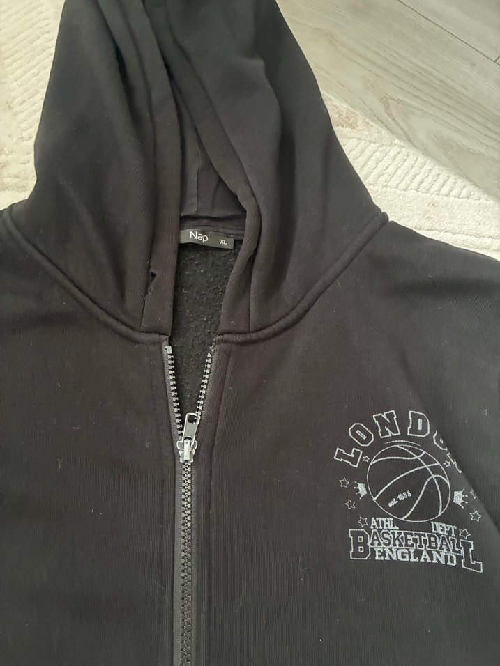 Siyah fermuarlı ceket, yuvarlak yaka ve uzun kolludur. Yumuşak kumaştan yapılmış, baskılı basketbol deseni ve dar kesimi vardır.