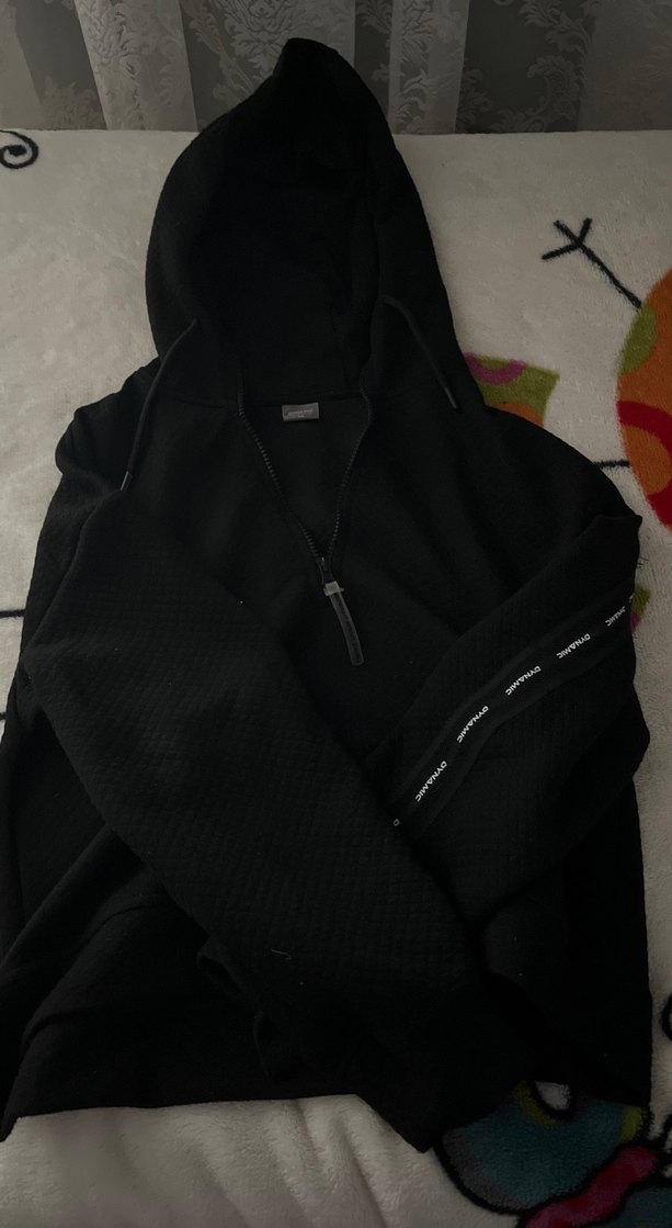 Siyah renkli, fermuarlı ve kapüşonlu erkek sweatshirt. Yumuşak fleece kumaştan, uzun kollu ve normal midi boyda, bol kesimdir.