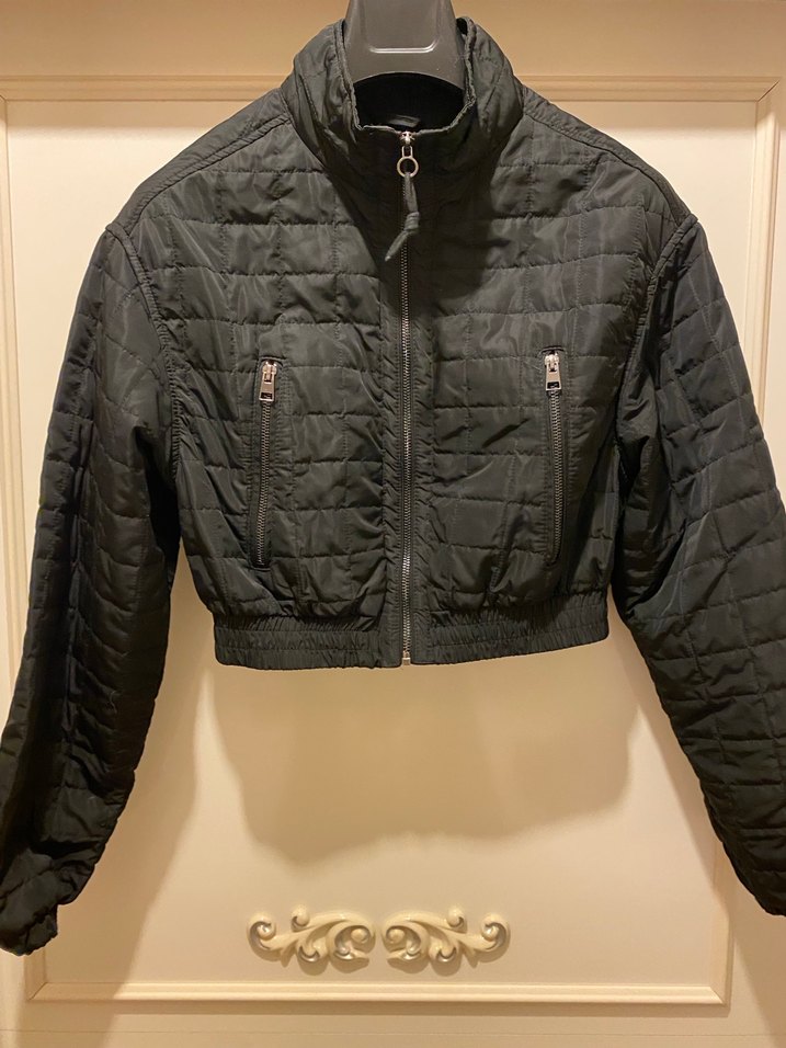 Siyah, fermuarlı, yüksek yakalı ve uzun kollu, kısa kesim, günlük kullanıma uygun kadın mont.