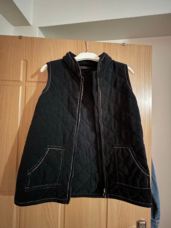Siyah pamuklu kumaştan, fermuarlı, yüksek yakalı, altın detaylı füme yelek. Kolsuz ve iki ceplidir, günlük rahat kullanıma uygundur.