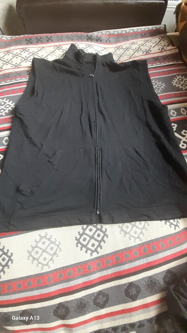 Siyah, fermuarlı, kolsuz, yüksek yakalı spor yelek. Sentetik kumaştan, rahat kesim ve normal midi boyda, günlük sokak stiline uygun.