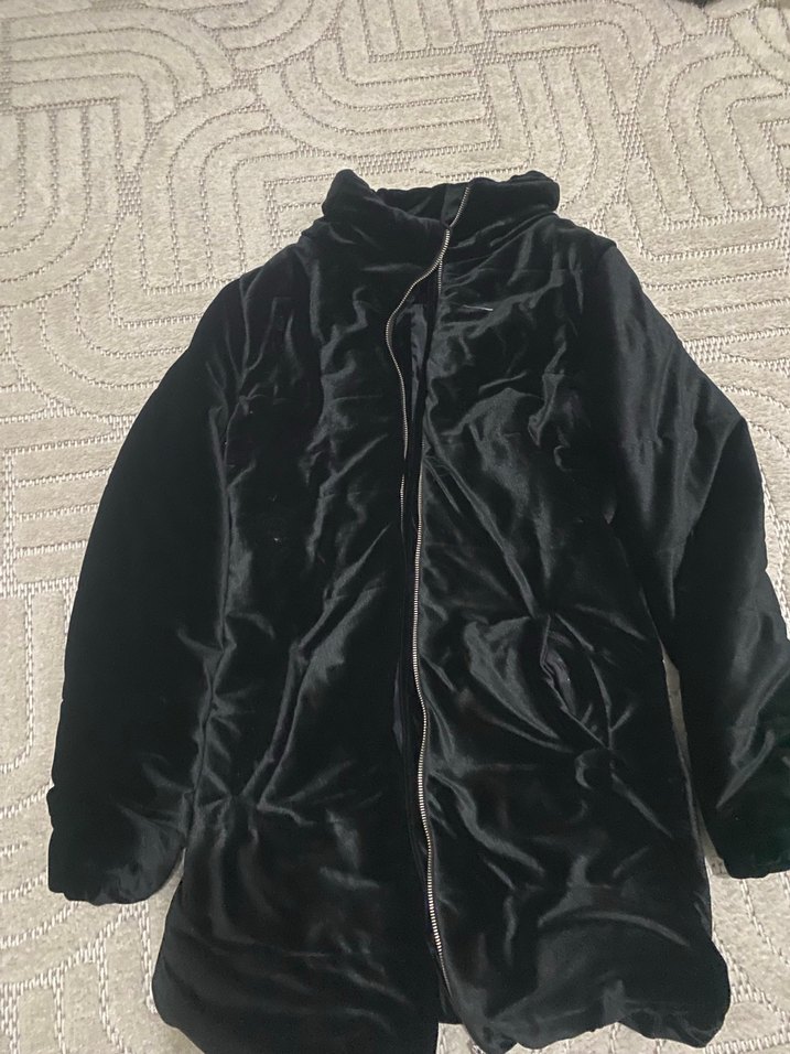 Yumuşak, rahat kumaştan yapılmış, fermuarlı, yüksek yakalı siyah, vücuda oturan uzun kollu midi kadın ceketi. Sokak modasına uygun.