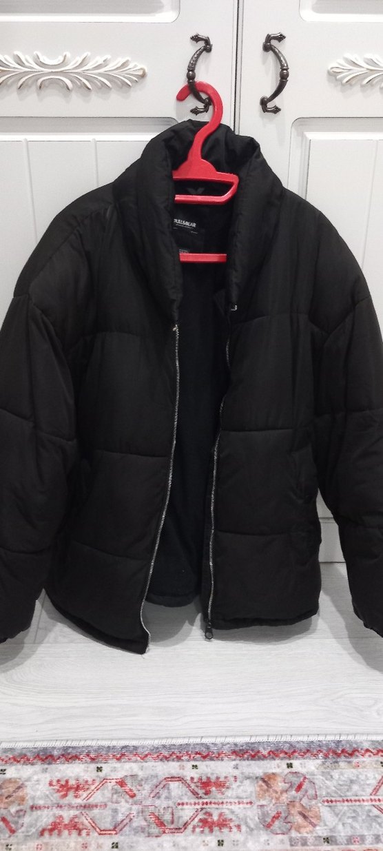 Pull Berar Fermuarlı önü, yüksek yakası ve uzun kollu, yumuşak ve sıcak kumaştan yapılmış siyah, bol kesim kışlık mont. Midi boyda, günlük sokak stili için uygun. ❄️