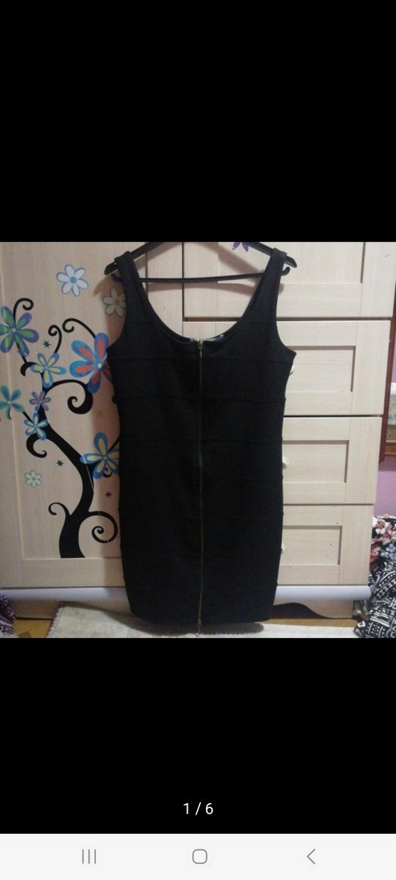 Siyah renkli, fermuarlı kolsuz ve vücuda oturan mini elbisedir.