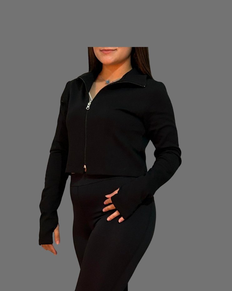 Kendi markamın ürünüdür. Bu siyah, dar kesim ceket yüksek yakalı ve uzun kolludur, başparmak deliği bulunur. Fermuarlı ve kısa boylu, yumuşak ve sıcak kumaştan üretilmiştir. DGFit College olarak yeniyiz ve ürünler logo etiketli olarak üretilmiştir. S, M, L bedenleri mevcuttur