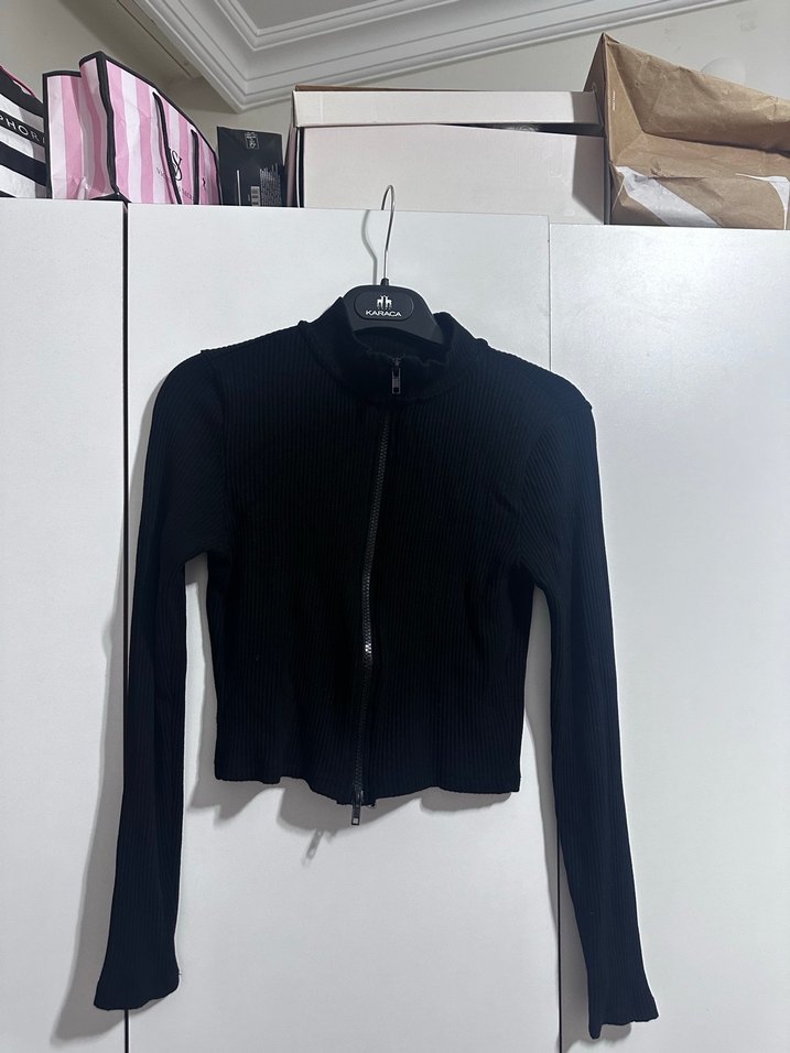 Dar kesim, uzun kollu ve yüksek yakalı kadın ceketi, yumuşak ve sıcak kumaştan üretilmiştir. Fermuarlı ve kısa boylu, günlük sokak stili için uygundur.