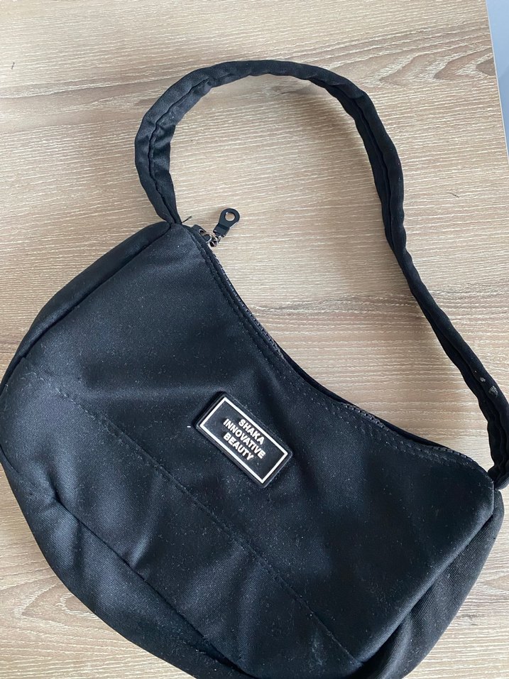 Fermuarlı, siyah sentetik kumaştan minimalist baskılı kadın omuz çantası. Günlük kullanıma uygun, trend sokak stili.