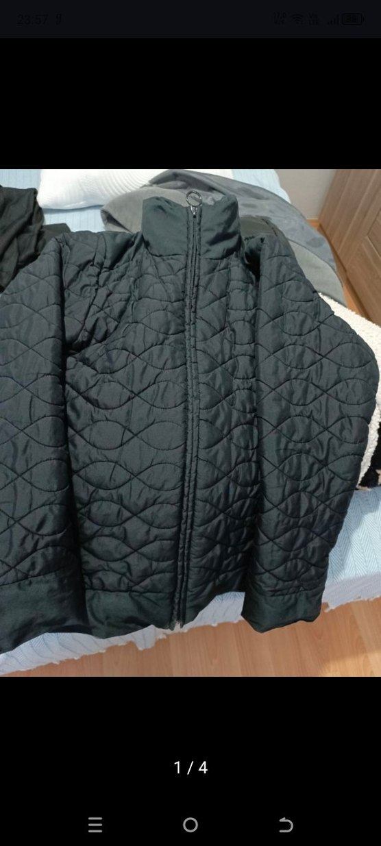 Siyah, fermuarlı, uzun kollu ve boğazlı mont. Orta uzunlukta, kapitone desende, rahat ve günlük kullanım için uygun.