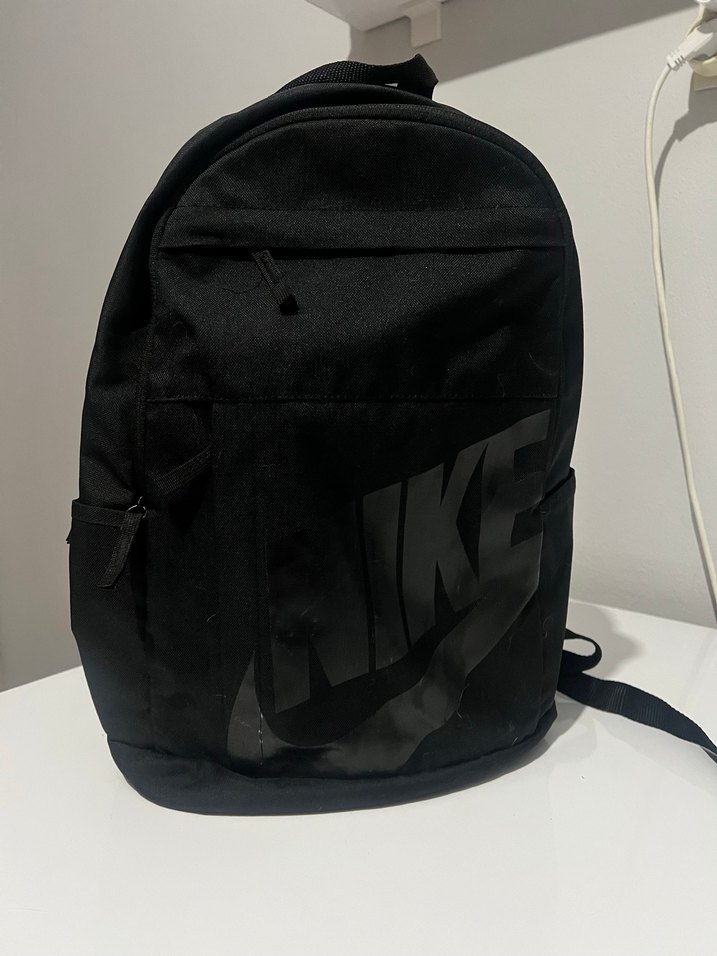 Siyah renkli Nike sırt çantası, büyük baskılı logo ve fermuarlı bölmelerle sokak stili ve rock punk havası sunar.