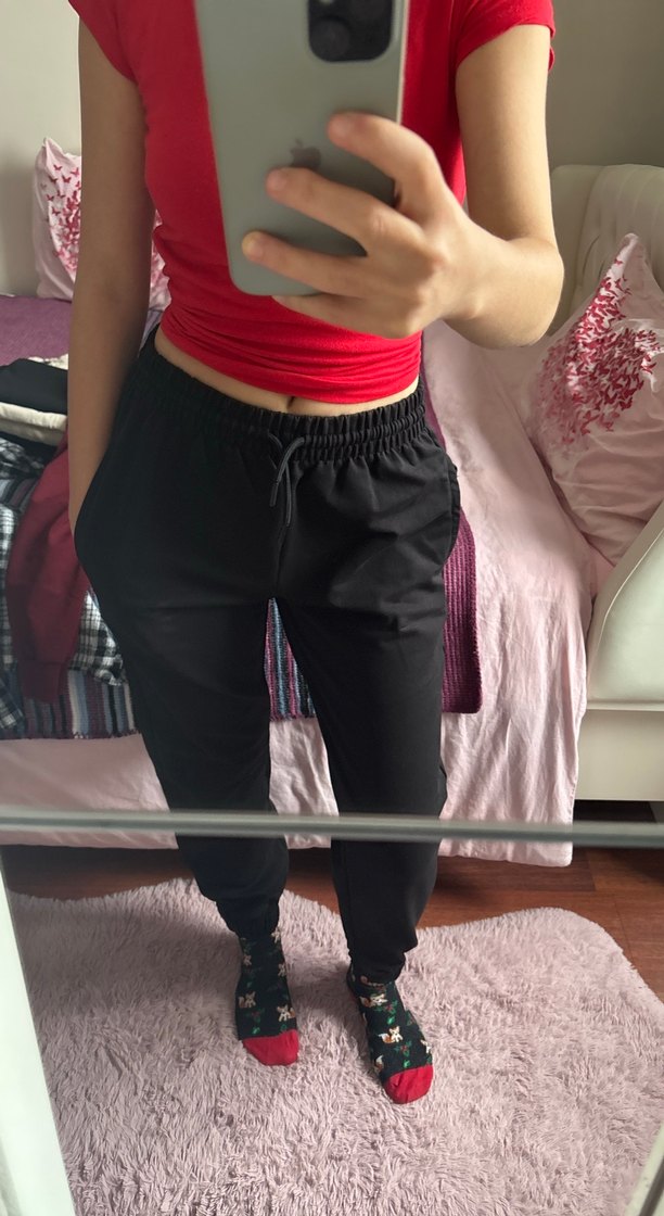 Siyah, sentetik kumaştan, fermuarlı ceplere sahip rahat kesim erkek eşofman, dış mekan kullanımı için uygundur.