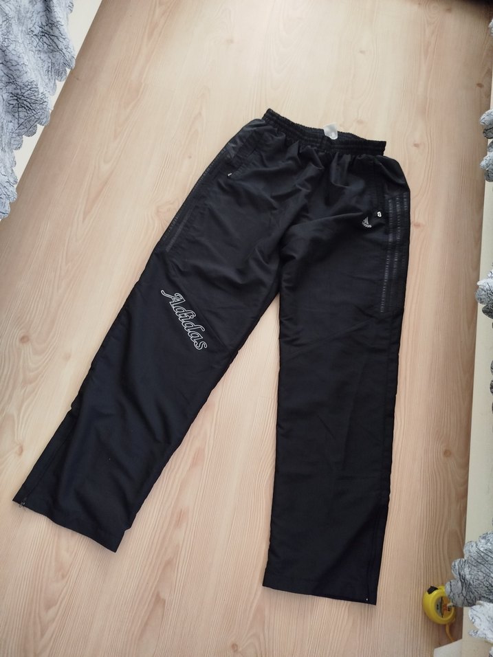 Siyah renkli, fermuarlı cepleri ve rahat kesimiyle sentetik kumaştan yapılmış erkek Eşofman