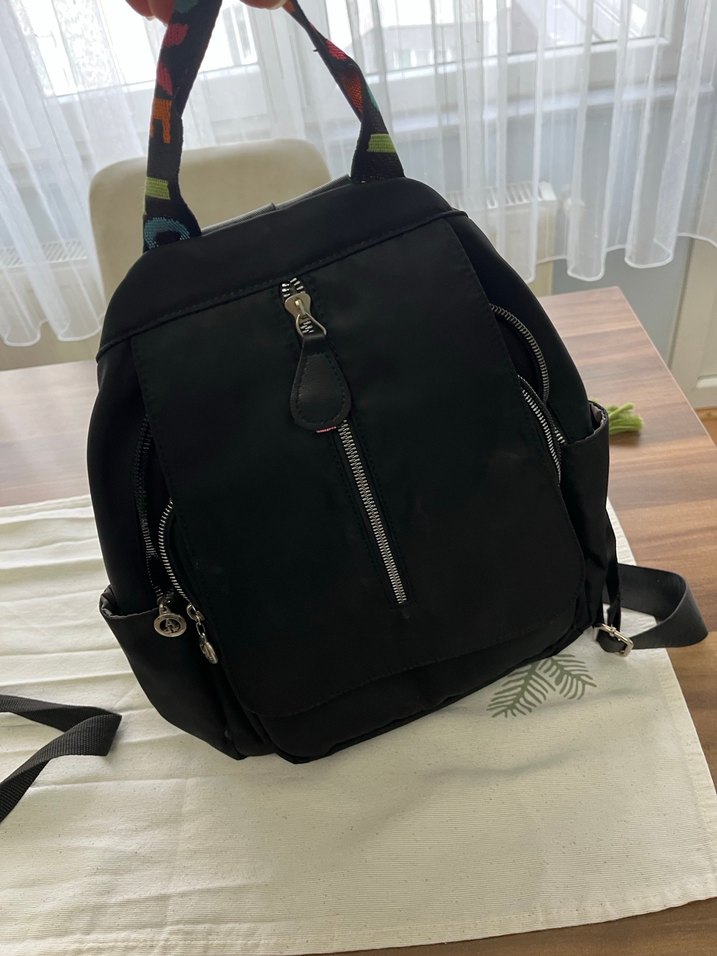 Siyah renkli, fermuarlı cepleri ve baskılı askıları olan, dayanıklı sentetik kumaştan yapılmış sırt çantası.