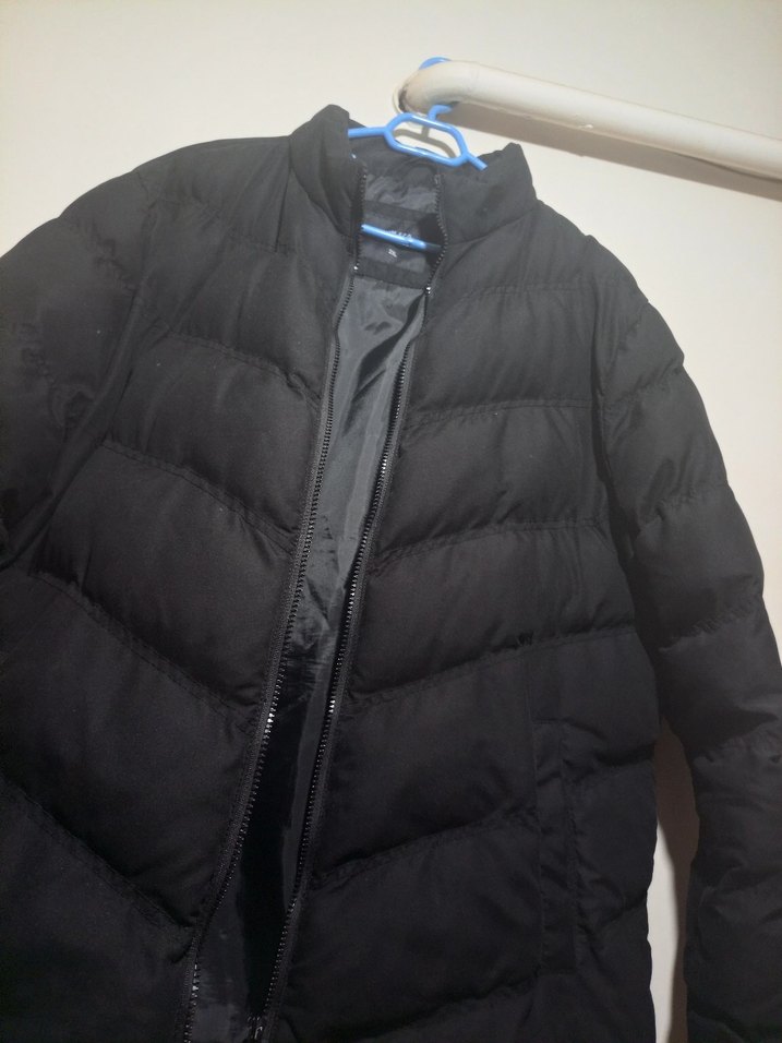 Siyah, fermuarlı, yüksek yakalı, uzun kollu kadın kışlık mont. Sentetik kumaştan, midi boy, dar kesim, sokak stili için uygun.