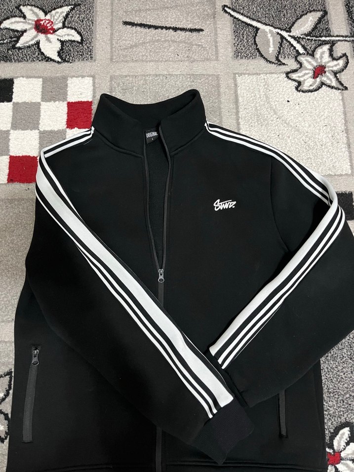 Bu siyah, fermuarlı ceket, yüksek yakalı ve uzun kolludur. Kollar boyunca beyaz şeritler bulunur. Yumuşak ve sıcak kumaştan yapılmıştır, gündelik kullanıma uygundur. Yırtık vs söz konusu değildir . Alınalı sadece 2 kere kullanılmıştır . Fazlalıktan dolayı kullanılmamıştır.