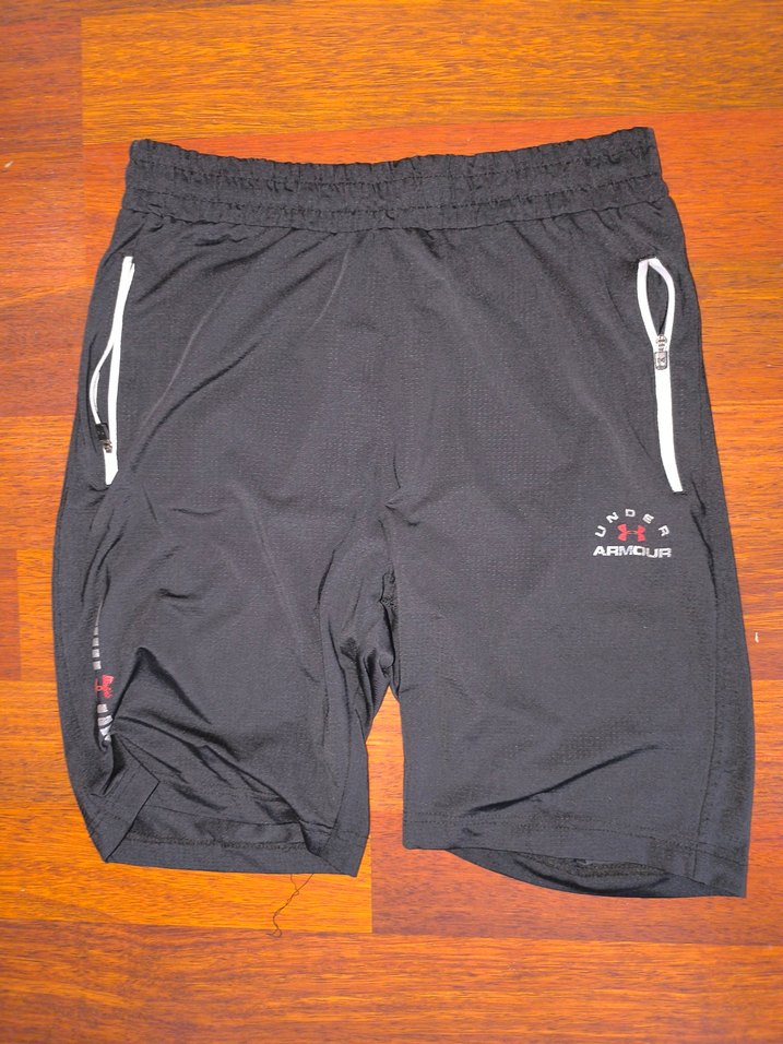 Fermuarlı cepleri ve sentetik kumaşıyla siyah, dar kesim erkek spor şortları, sokak stiline uygun.
