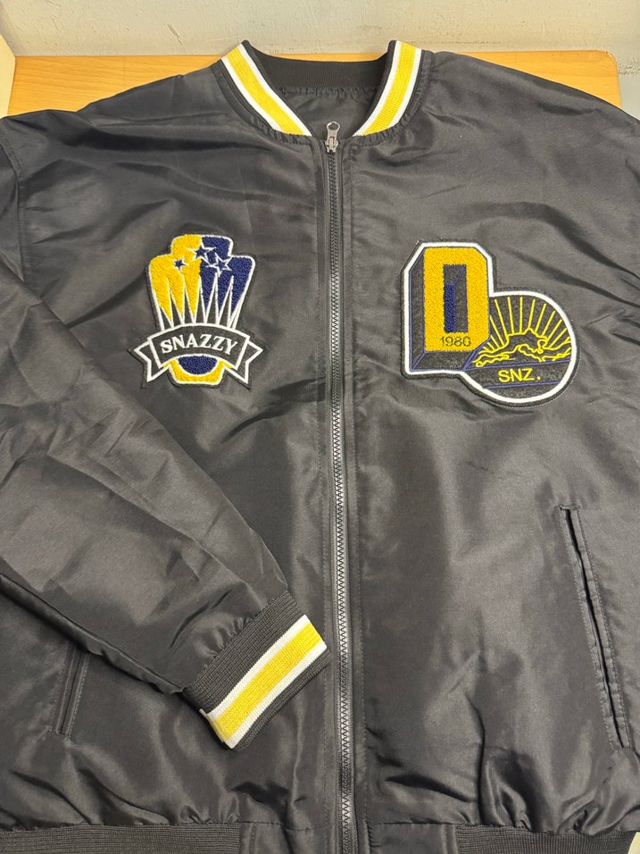 Siyah fermuarlı erkek ceket, baskılı detaylı, kesik yakalı ve uzun kollu. Yumuşak ve sıcak kumaştan, bol kesim ve normal boyda. "SNZ" yazılı işlemeli patchler içerir. Günlük kullanıma uygun.