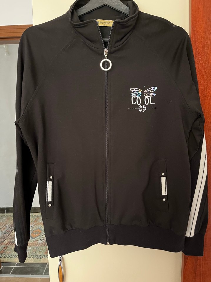 Siyah renkli, fermuarlı ve baskılı detaylara sahip, uzun kollu, bisiklet yaka ve rahat kesim kadın ceket. Sayılı kullanıldı.