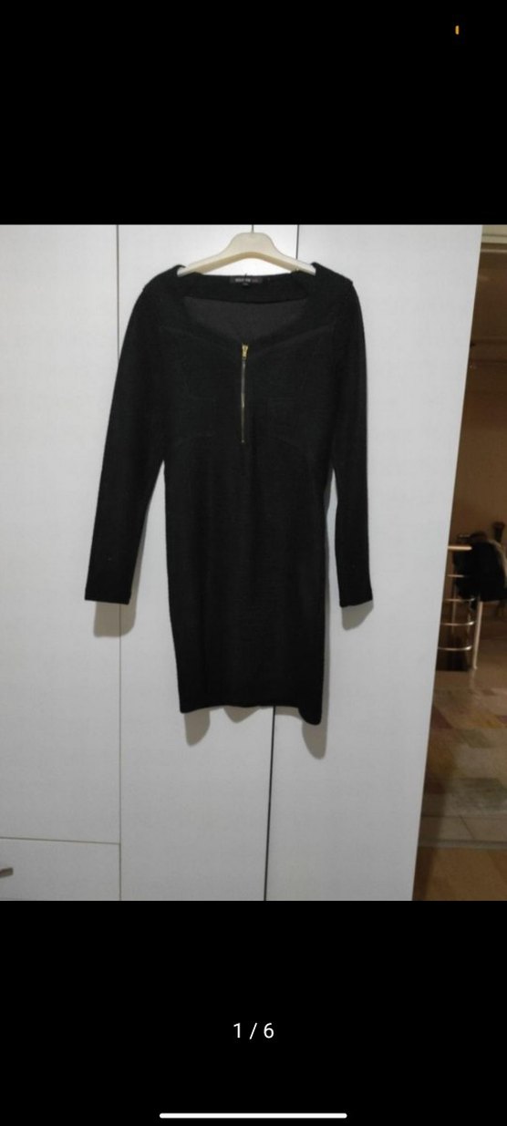 Bu siyah midi esnek hafif simli elbise, uzun kollu fermuarlı detaylıdır. Sade ve şık, esnek kumaştan yapılmıştır.